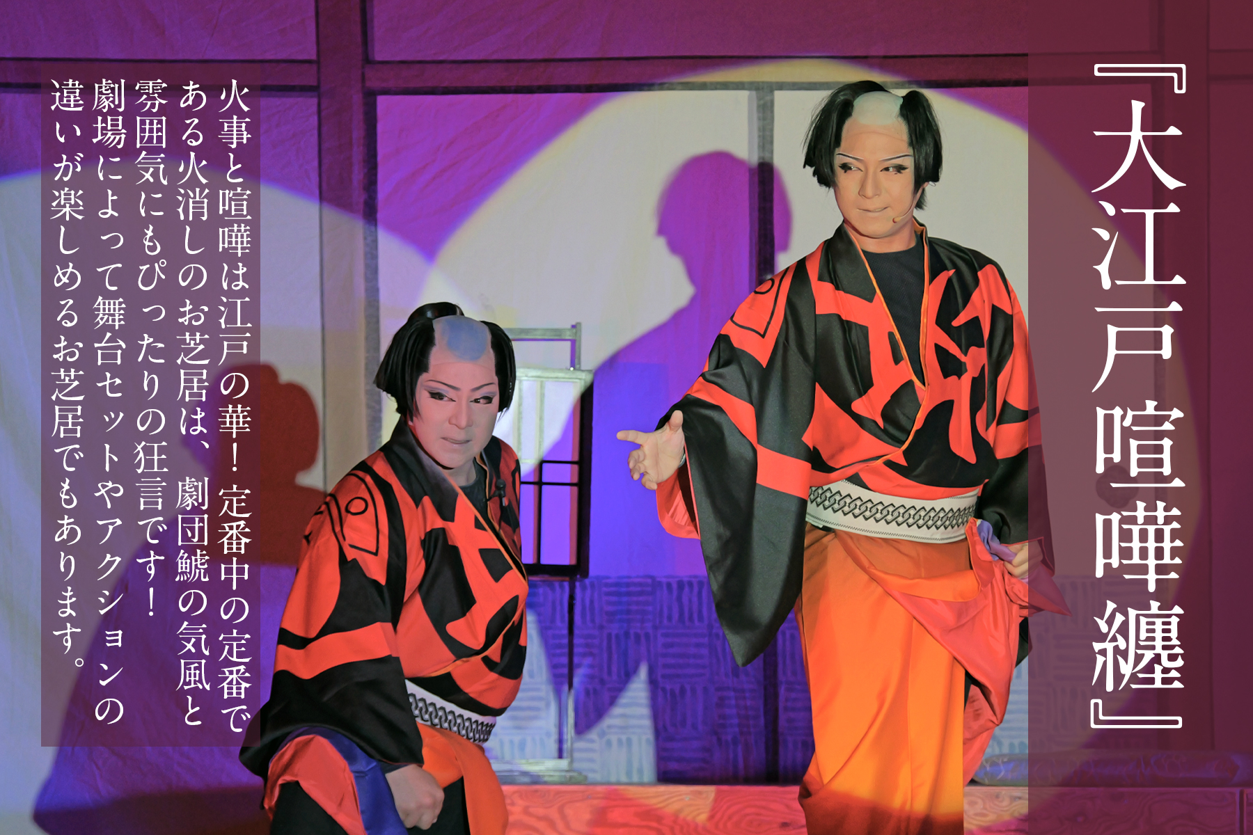火事と喧嘩は江戸の華! 定番中の定番である火消しのお芝居は、劇団鯱の気風と雰囲気にもぴったりの狂言です! 劇場によっては大掛かりなセットを組んでの舞台転換やアクションに出会えることも…! 大舞台が組める劇場でこのお芝居がかかった際には、是非とも足を運んでいただきたいお芝居のひとつです!