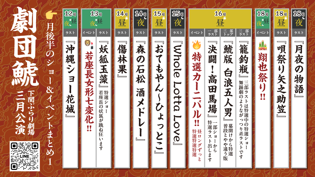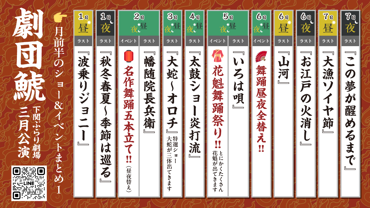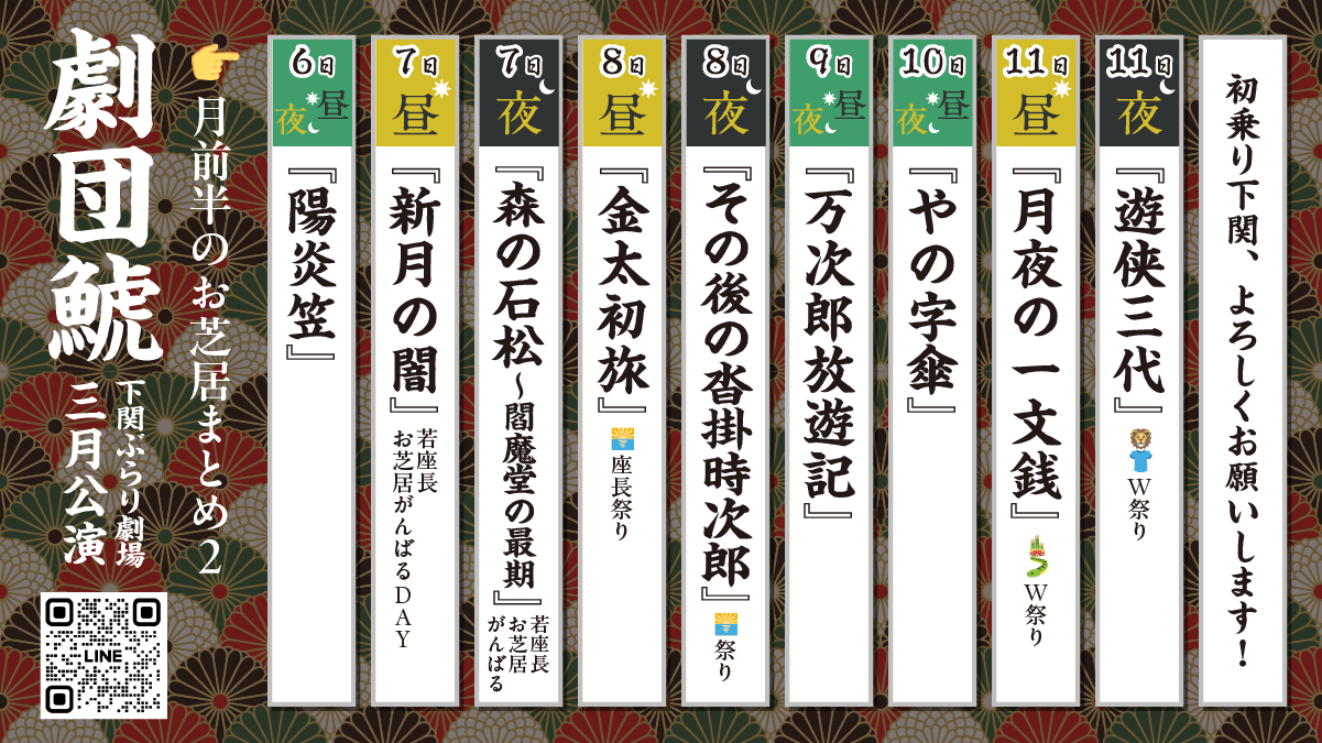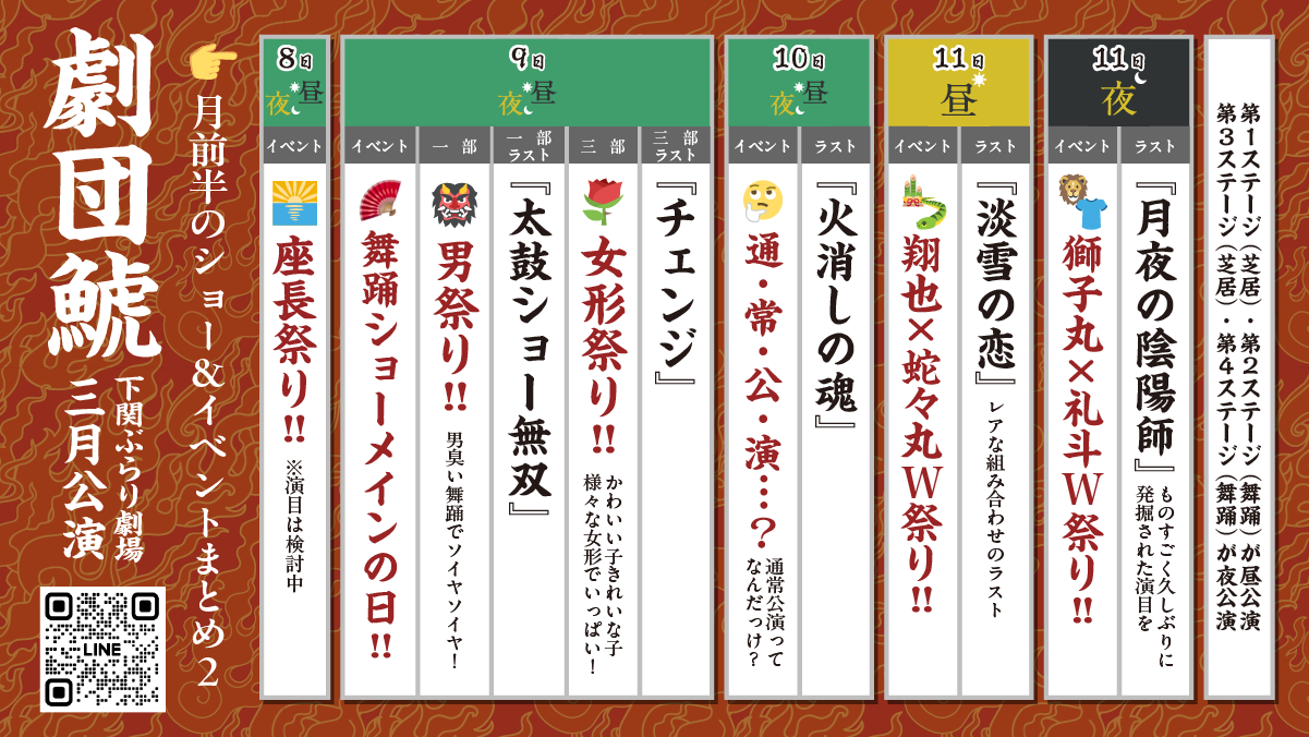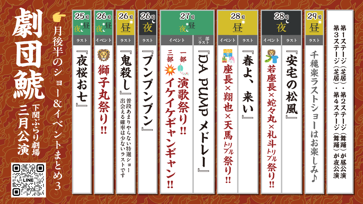 | 公演時間 | 昼の部 開演 13:00 夜の部 月〜木 19:00/日祝 18:30 ※金・土は夜公演なし |